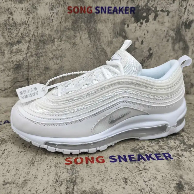 Based on the Japanese bullet train, the Nike Wmns Air Max 97 keeps the same design details envisioned by Christian Tresser that made it famous. This Nike Air Max 97 White Pure Platinum iteration—released in July 2019—arrives in Pure Platinum textile with reflective, water-ripple piping, tiered leather panels and dual pull tabs. Tone-on-tone logos can be found throughout. A full-length Max Air layer within the midsole and rubber outsole uphold the crisp look.
