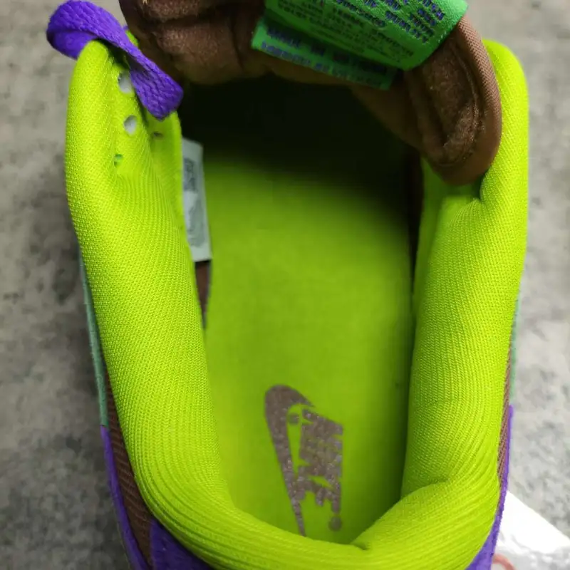 The 2020 edition of the Nike Dunk Low Veneer (2020) brings back one of the original colorways from the CO.JP ‘Ugly Duckling Pack’ from 2001. Like its predecessor, the upper is almost entirely constructed from pigskin suede, finished in a discordant blend of brown, green and purple hues. Breathable mesh is applied to the collar and tongue, accented with a traditional woven Nike tag. An additional pop of violet distinguishes the sneaker’s rubber outsole.